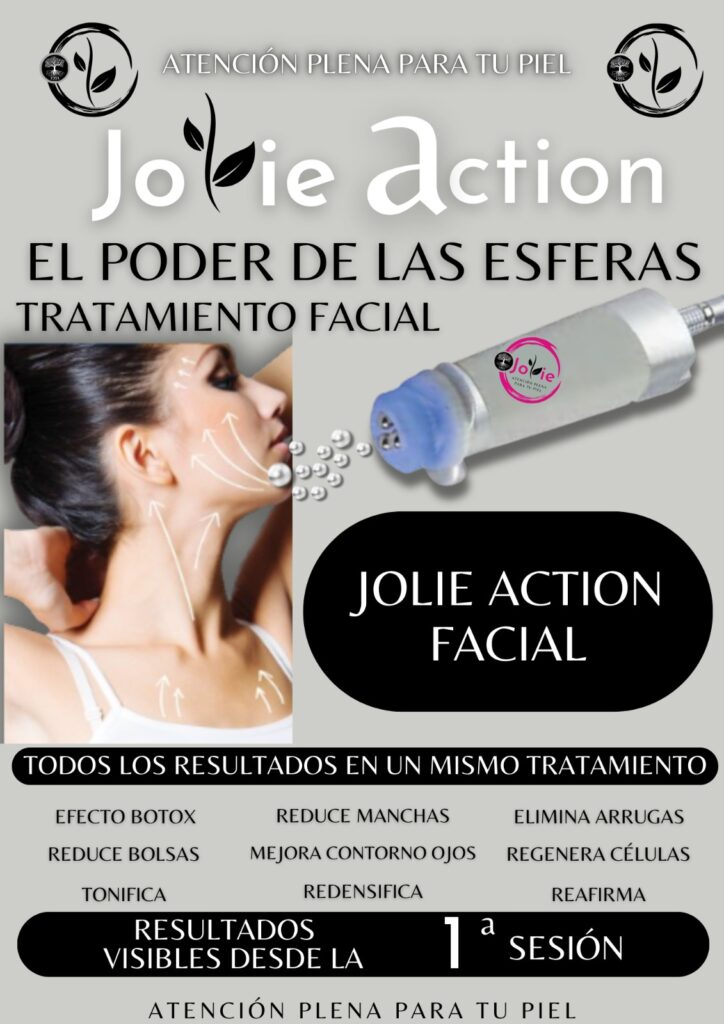 Jolie Action facial es un tratamiento fisio-activo de última generación, el poder de las esferas en cara, cuello y escote con resultados visibles desde la 1ª sesión, efecto Botox, efecto flash en tu piel, reducción en arrugas de expresión, mejora del contorno de ojos, reducción de bolsas y ojeras, reafirmación, tonificación, redensificación y regeneración de las células de tu cara, tratamiento integral revolucionario en la estética facial.