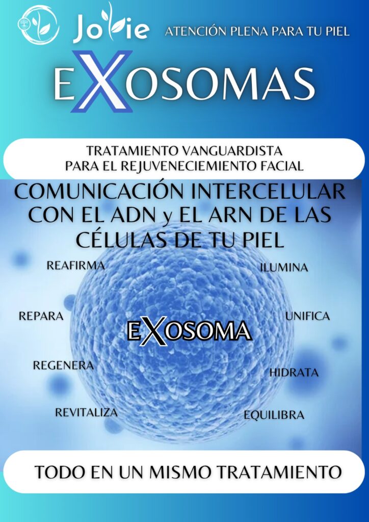 Tratamiento vanguardista top en la estética actual. Comunicación intercelular con el ADN y el ARN de las células de tu piel. Multiplica la capacidad de producción de las células de tu piel con unos efectos inmediatos. Con el paso del tiempo las células disminuyen y aletargan su capacidad de producción tan necesarios para tu piel, el tratamiento facial Exosomas activa y multiplica esa capacidad hasta unos niveles óptimos para generar en tu piel la vitalidad perdida. Resultados visibles en cada sesión. Atención plena para tu piel con Exosomas Jolie, tratamiento avalado por SKIN CLINIC.